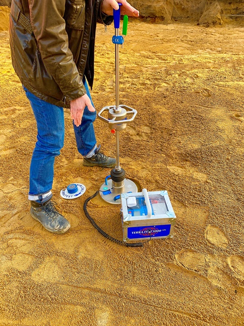 Nach der Verfüllung prüft ein Prüfingenieur die Verdichtung des Sandbodens als Grundlage für die Bodenplatte in Hamburg. Mit geeigneten Messverfahren wird sichergestellt, dass die erforderliche Dichte erreicht ist. Das Bild zeigt die Qualitätskontrolle im Erdbau ein entscheidender Schritt für eine tragfähige und sichere Gründung. Solche Prüfungen sind fester Bestandteil professioneller Erdarbeiten und gewährleisten eine dauerhaft stabile Ausführung.